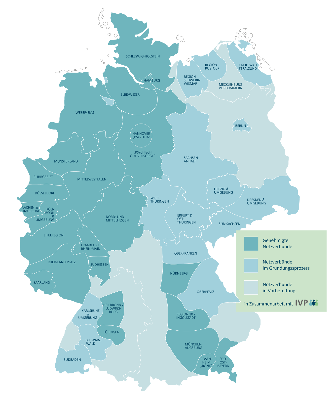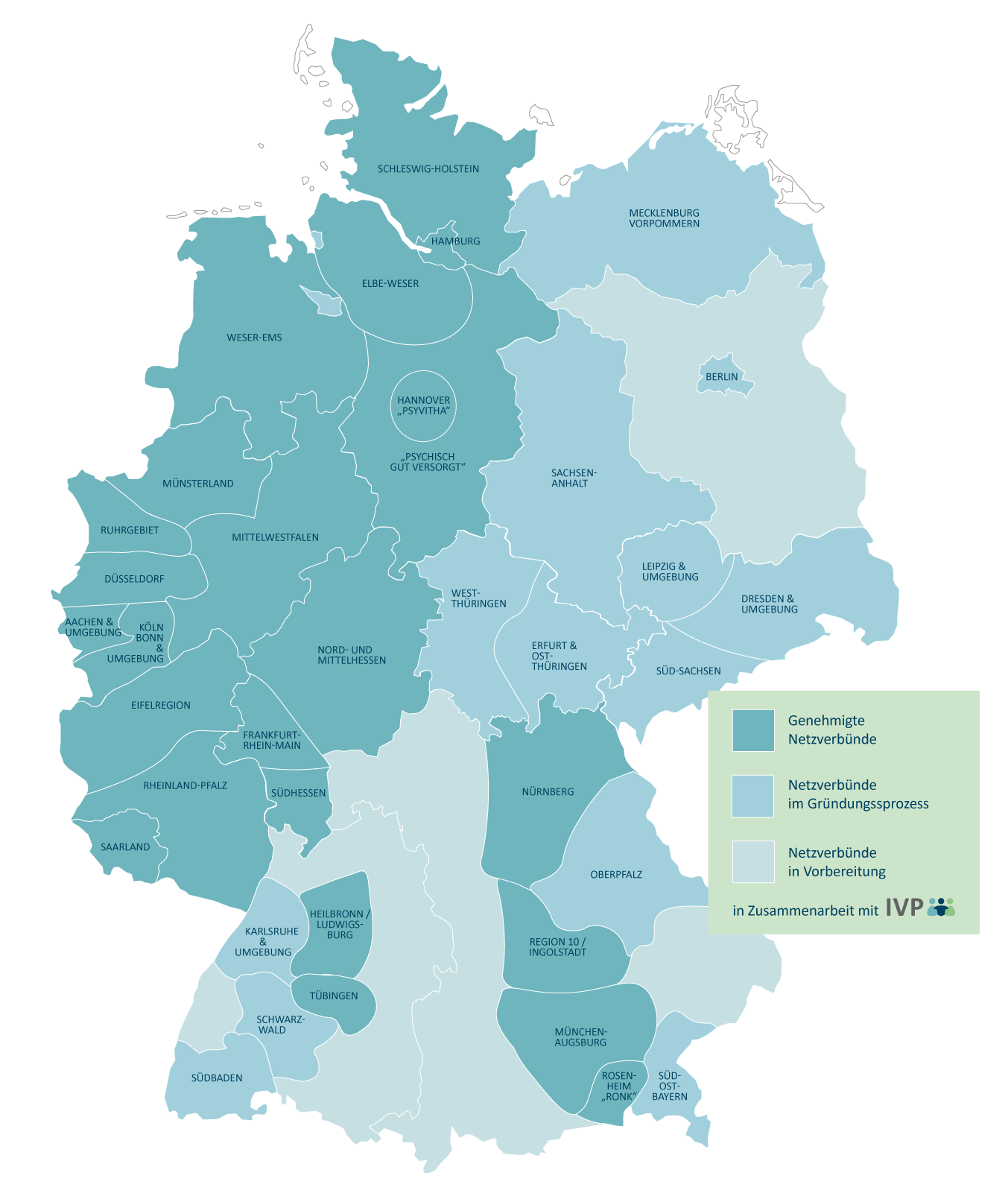 Der Erfolg zeigt sich klar: 23 von bundesweit 26 genehmigten Netzverbünden wurden mit Unterstützung von IVP aufgebaut (Stand November 2025). IVP freut sich über das Vertrauen von und die Zusammenarbeit mit derzeit: